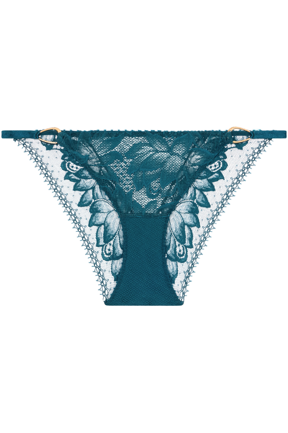 The Flawless Love Mini Coeur Brief is cut low on the hips with a brazilian-style back for a flattering, cheeky silhouette. Delicate Leavers lace and fishnet reveal just enough, while hammered gold accents add a final touch of opulence.