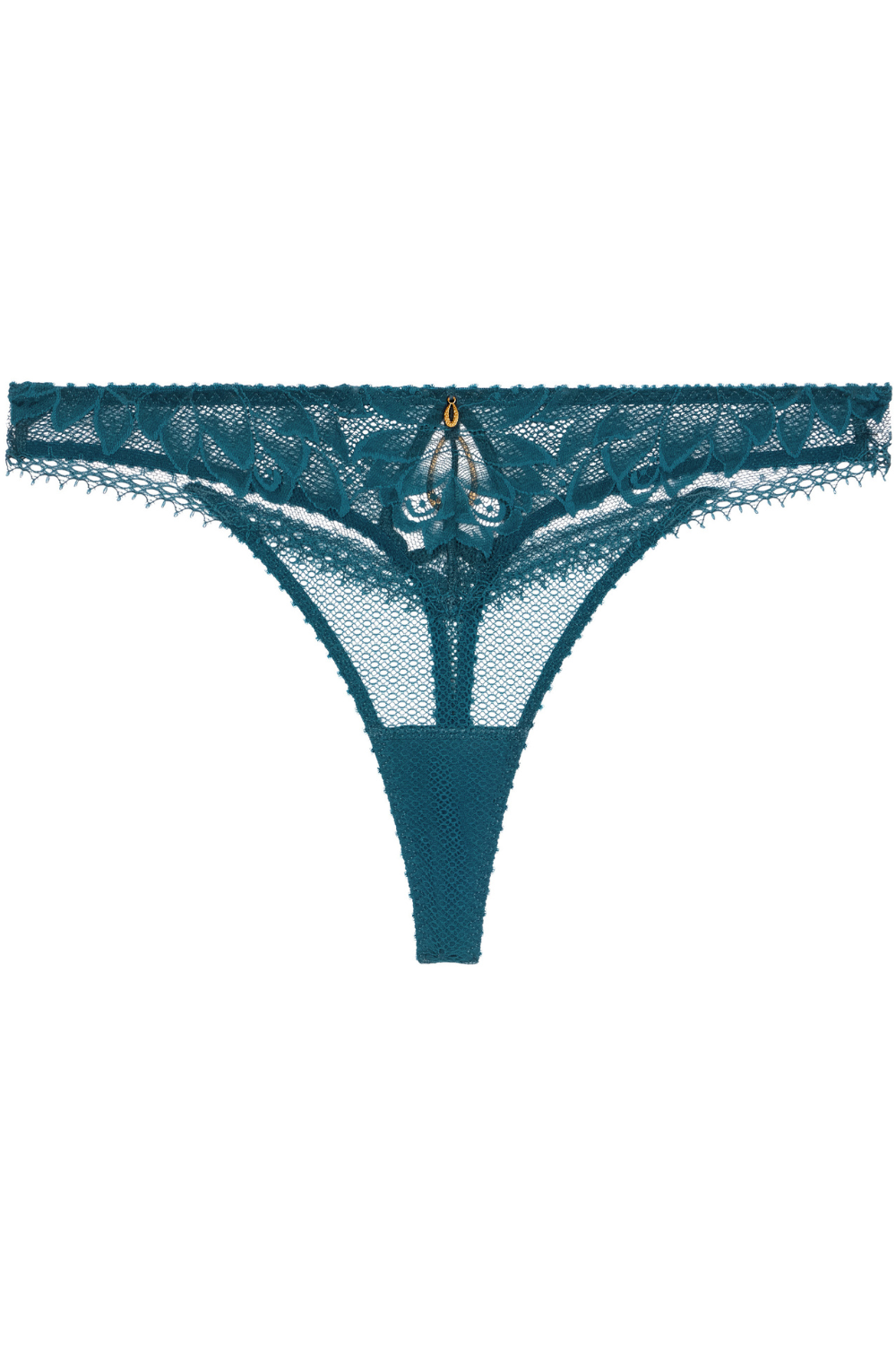 The Flawless Love Tanga Thong is crafted from Leavers lace and graphic fishnet in a daring cut that hugs the hips, complete with a hammered golden ring at the back for a hint of luxury.